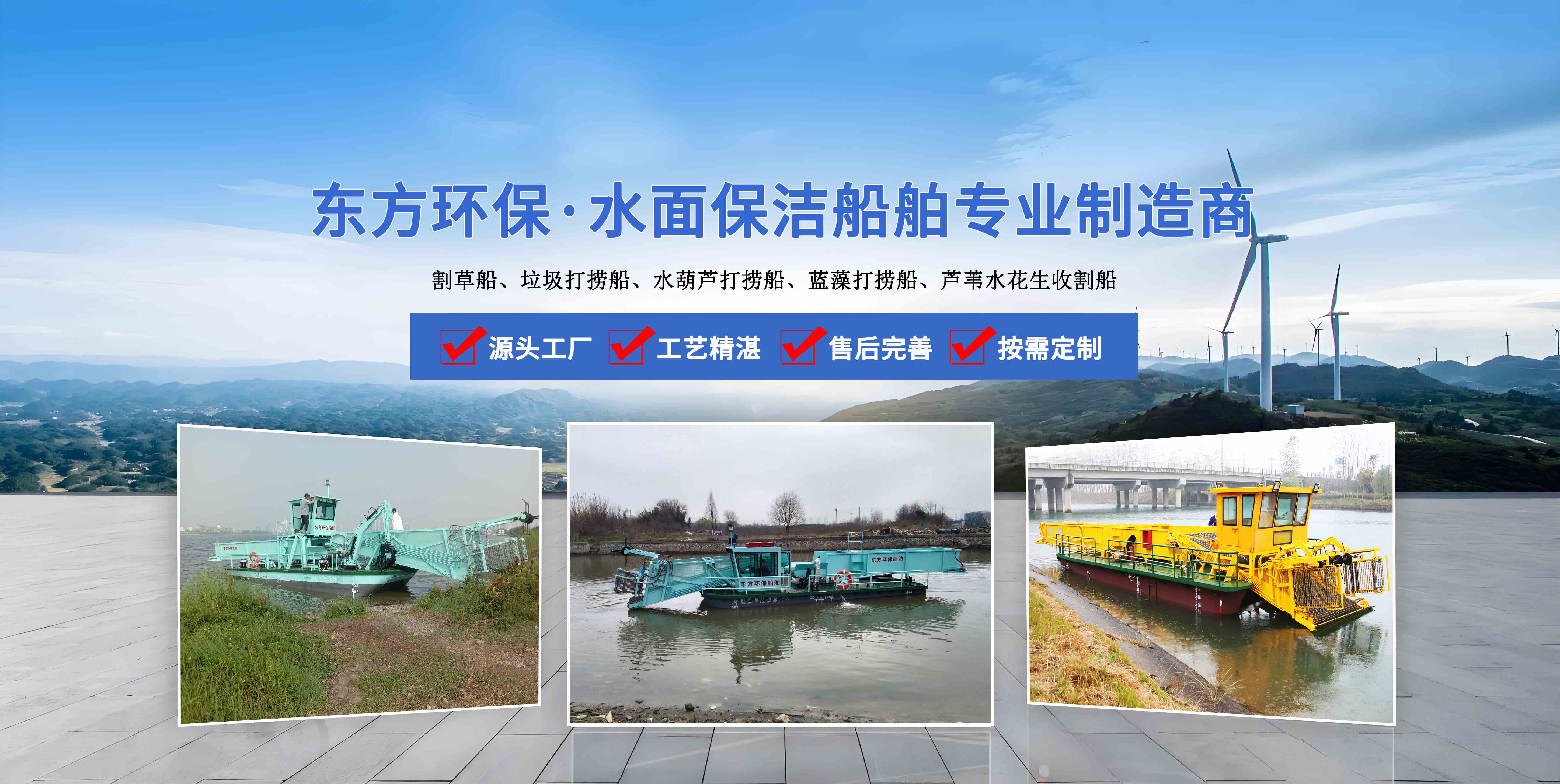 東方船舶是集研發(fā)、生產(chǎn)、服務(wù)為一體的現(xiàn)代化企業(yè),產(chǎn)品十幾種系列 主營業(yè)務(wù):清潔船、水草收割船、垃圾打撈船、水面保潔船等